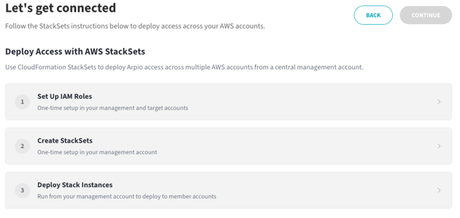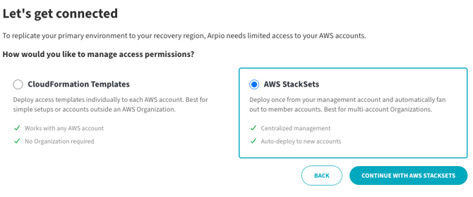 On the next screen, you will see “AWS StackSets” as an option to manage Arpio’s access permissions. Select “AWS StackSets” and Click the “CONTINUE WITH AWS STACKSETS” button.