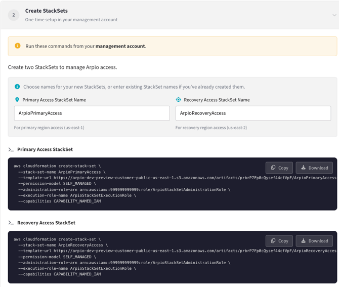 - Enter names for your StackSets in the input fields (e.g., ArpioPrimaryAccess and ArpioRecoveryAccess)