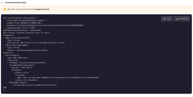 { "StackId": "arn:aws:cloudformation:us-east-1:YOUR-ACCOUNT:stack/ArpioStackSetAdministrationRole/..."}
