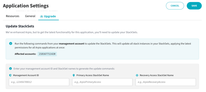 In the Arpio console, you’ll be prompted to update your StackSets in the Application Settings “Upgrade” tab when a new template version is available. The above command will be automatically generated for the user to apply to their StackSets. Regardless of which application you access this command from, it will only need to be run once per StackSet to update all Arpio applications.