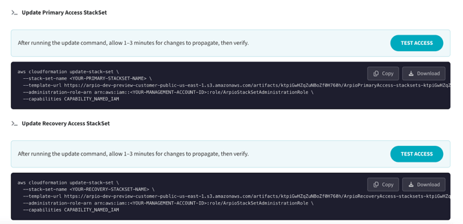 Arpio periodically updates our permissions to introduce new capabilities to our automation. When that happens, a new set of CloudFormation templates are generated.