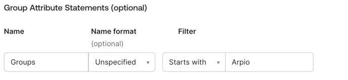 - Filter: (use a filter that will match the with the groups in Okta that will be used to give your users access to Arpio)
